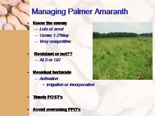 Managing Palmer Amaranth<BR>Know the enemy <BR>Lots of seed <BR>Grows 1-2”/day <BR>Very competitive <BR> <BR> Resistant or not?? <BR>ALS or GR <BR> <BR>Residual herbicide <BR>Activation <BR>irrigation or incorporation <BR> <BR>Timely POST’s <BR> <BR>Avoid overusing PPO’s<BR>