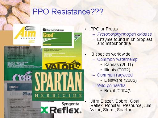 PPO Resistance???<BR>PPO or Protox <BR>Protoporphyrinogen oxidase <BR>Enzyme found in chloroplast and mitochondria <BR> <BR> 3 species worldwide <BR>Common waterhemp <BR>Kansas (2001) <BR>Illinois (2002) <BR>Common ragweed <BR>Delaware (2005) <BR>Wild poinsettia <BR>Brazil (2004)\ <BR> <BR>Ultra Blazer, Cobra, Goal, Reflex, Ronstar, Resource, Aim, Valor, Storm, Spartan<BR>