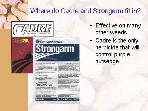 Where do Cadre and Strongarm fit in?<BR>Effective on many other weeds <BR>Cadre is the only herbicide that will control purple nutsedge<BR>