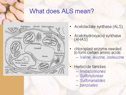 What does ALS mean?<BR>Acetolactate synthase (ALS) <BR> <BR>Acetohydroxyacid synthase (AHAS) <BR> <BR>chloroplast enzyme needed to form certain amino acids <BR>Valine, leucine, isoleucine <BR> <BR>Herbicide families <BR>Imidazolinones <BR>Sulfonylureas  <BR>Sulfonanalides <BR>benzoates<BR>