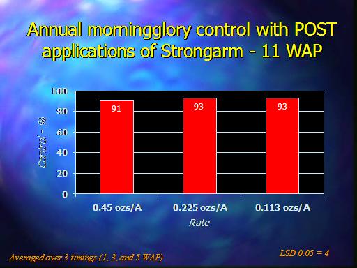 Annual morningglory control with POST applications of Strongarm - 11 WAP<BR>Averaged over 3 timings (1, 3, and 5 WAP)<BR>LSD 0.05 = 4<BR>