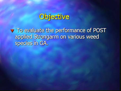 Objective<BR> To evaluate the performance of POST applied Strongarm on various weed species in GA.<BR>