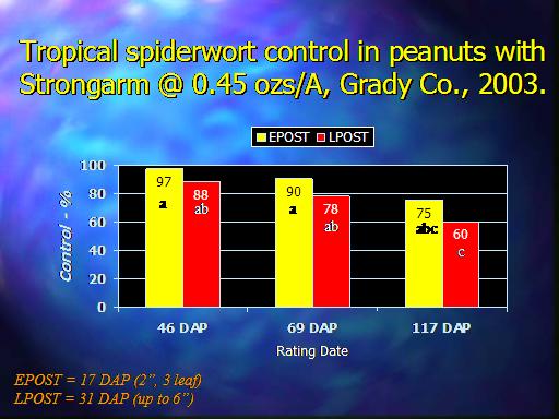 Tropical spiderwort control in peanuts with Strongarm @ 0.45 ozs/A, Grady Co., 2003.<BR>EPOST = 17 DAP (2”, 3 leaf)