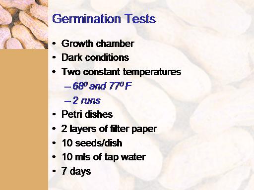 Germination Tests<BR>Growth chamber <BR>Dark conditions <BR>Two constant temperatures <BR>680 and 770 F <BR>2 runs <BR>Petri dishes <BR>2 layers of filter paper <BR>10 seeds/dish <BR>10 mls of tap water <BR>7 days<BR>