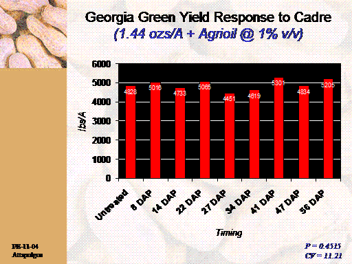 Georgia Green Yield Response to Cadre (1.44 ozs/A + Agrioil @ 1% v/v)<BR>P = 0.4515 <BR>CV = 11.21<BR>PE-11-04 <BR>Attapulgus<BR>