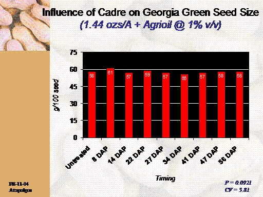 Influence of Cadre on Georgia Green Seed Size (1.44 ozs/A + Agrioil @ 1% v/v)<BR>P = 0.0921 <BR>CV = 3.81<BR>PE-11-04 <BR>Attapulgus<BR>