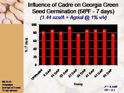 Influence of Cadre on Georgia Green Seed Germination (680F - 7 days) (1.44 ozs/A + Agrioil @ 1% v/v)<BR>P = 0.1689 <BR>CV = 9.2<BR>PE-11-04 <BR>Attapulgus <BR>(average of 2 runs) <BR>74 day old seed<BR>