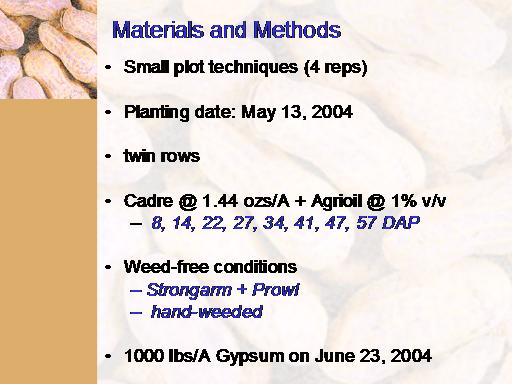 Materials and Methods<BR>Small plot techniques (4 reps) <BR> <BR>Planting date: May 13, 2004  <BR> <BR>twin rows <BR> <BR>Cadre @ 1.44 ozs/A + Agrioil @ 1% v/v <BR> 8, 14, 22, 27, 34, 41, 47, 57 DAP <BR> <BR>Weed-free conditions <BR>Strongarm + Prowl <BR> hand-weeded <BR> <BR>1000 lbs/A Gypsum on June 23, 2004<BR>