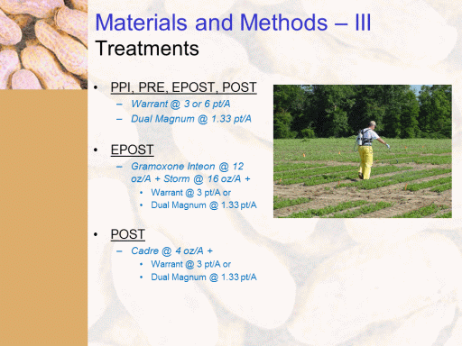 Materials and Methods – III Treatments<BR>PPI, PRE, EPOST, POST <BR>Warrant @ 3 or 6 pt/A <BR>Dual Magnum @ 1.33 pt/A <BR> <BR>EPOST <BR>Gramoxone Inteon @ 12 oz/A + Storm @ 16 oz/A +  <BR>Warrant @ 3 pt/A or <BR>Dual Magnum @ 1.33 pt/A <BR> <BR>POST <BR>Cadre @ 4 oz/A + <BR>Warrant @ 3 pt/A or <BR>Dual Magnum @ 1.33 pt/A<BR>