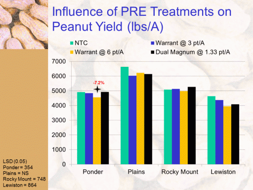 Influence of PRE Treatments on Peanut Yield (lbs/A)<BR>LSD (0.05) <BR>Ponder = 354 <BR>Plains = NS <BR>Rocky Mount = 748 <BR>Lewiston = 864<BR>-7.2%<BR>