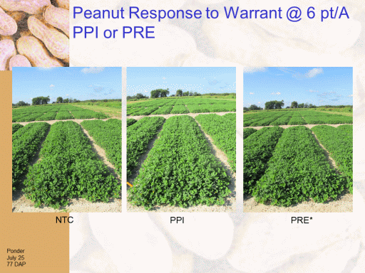 Peanut Response to Warrant @ 6 pt/A PPI or PRE <BR>Ponder <BR>July 25 <BR>77 DAP<BR>NTC<BR>PPI<BR>PRE*<BR>
