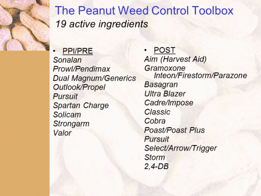 The Peanut Weed Control Toolbox 19 active ingredients<BR>PPI/PRE <BR>Sonalan <BR>Prowl/Pendimax <BR>Dual Magnum/Generics <BR>Outlook/Propel <BR>Pursuit <BR>Spartan Charge <BR>Solicam <BR>Strongarm <BR>Valor <BR>POST <BR>Aim (Harvest Aid) <BR>Gramoxone Inteon/Firestorm/Parazone <BR>Basagran <BR>Ultra Blazer <BR>Cadre/Impose <BR>Classic <BR>Cobra <BR>Poast/Poast Plus <BR>Pursuit <BR>Select/Arrow/Trigger <BR>Storm <BR>2,4-DB <BR>