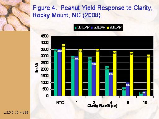 Figure 4.  Peanut Yield Response to Clarity, Rocky Mount, NC (2008).<BR>LSD 0.10 = 466<BR>