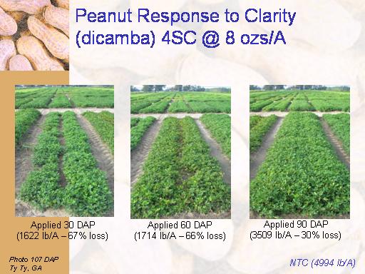 Peanut Response to Clarity (dicamba) 4SC @ 8 ozs/A<BR>Applied 30 DAP <BR>(1622 lb/A – 67% loss)<BR>Applied 60 DAP <BR>(1714 lb/A – 66% loss)<BR>Applied 90 DAP <BR>(3509 lb/A – 30% loss)<BR>Photo 107 DAP <BR>Ty Ty, GA<BR>NTC (4994 lb/A)<BR>