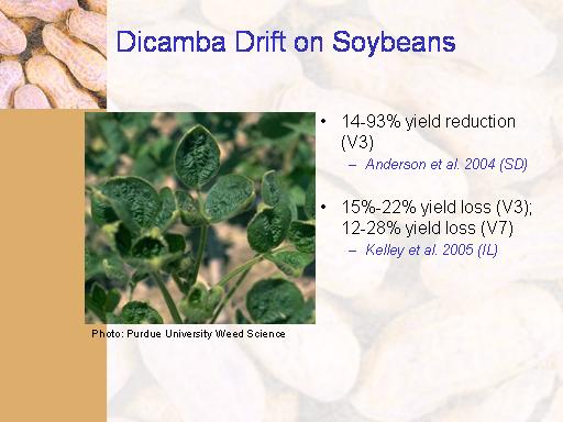 Dicamba Drift on Soybeans<BR>14-93% yield reduction (V3) <BR>Anderson et al. 2004 (SD) <BR> <BR>15%-22% yield loss (V3); 12-28% yield loss (V7) <BR>Kelley et al. 2005 (IL)<BR>