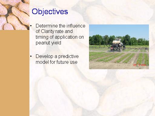 Objectives<BR>Determine the influence of Clarity rate and timing of application on peanut yield <BR> <BR>Develop a predictive model for future use<BR>