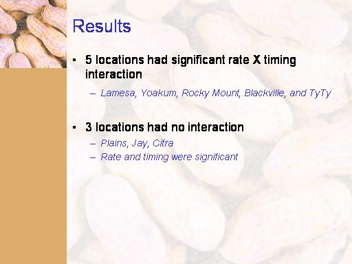 Results<BR>5 locations had significant rate X timing  interaction <BR>Lamesa, Yoakum, Rocky Mount, Blackville, and TyTy  <BR> <BR>3 locations had no interaction <BR>Plains, Jay, Citra <BR>Rate and timing were significant<BR>