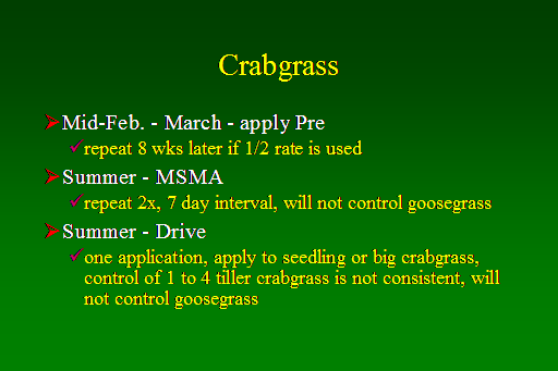 Crabgrass<BR>Mid-Feb. - March - apply Pre