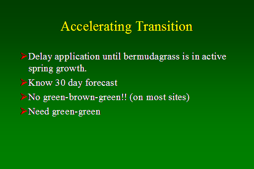 Accelerating Transition<BR>Delay application until bermudagrass is in active spring growth.