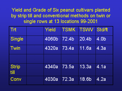 Yield and Grade of Six peanut cultivars planted by strip till and conventional methods on twin or single rows at 13 locations 99-2001<BR>