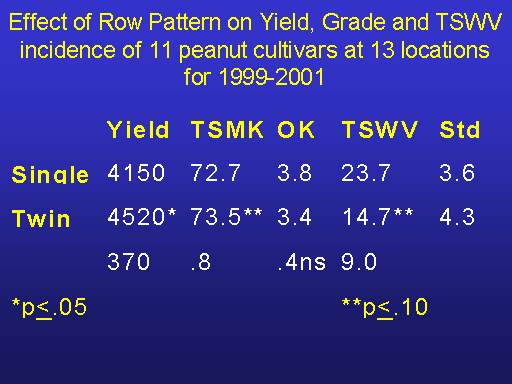 Effect of Row Pattern on Yield, Grade and TSWV incidence of 11 peanut cultivars at 13 locations for 1999-2001<BR>