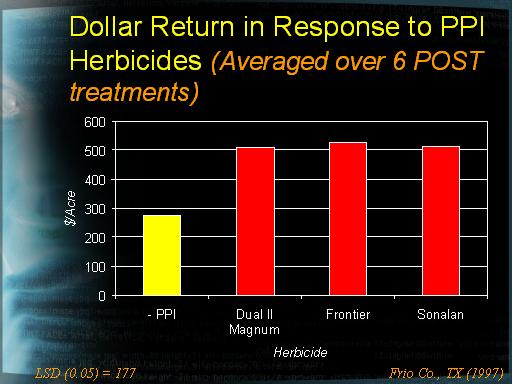 Dollar Return in Response to PPI Herbicides (Averaged over 6 POST treatments)<BR>LSD (0.05) = 177<BR>Frio Co., TX (1997)<BR>