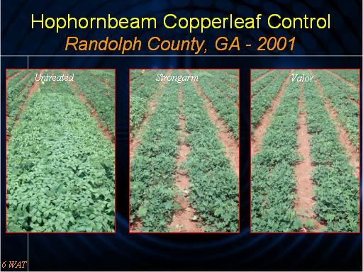 Hophornbeam Copperleaf ControlRandolph County, GA - 2001<BR>6 WAT<BR>Untreated<BR>Strongarm<BR>Valor<BR>