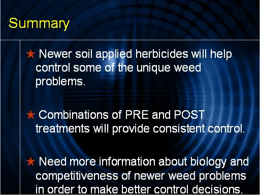 Summary<BR> Newer soil applied herbicides will help control some of the unique weed problems.