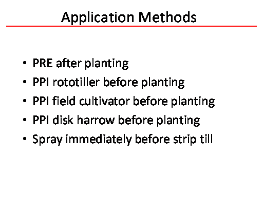 Application Methods<BR> <BR>PRE after planting <BR>PPI rototiller before planting <BR>PPI field cultivator before planting <BR>PPI disk harrow before planting <BR>Spray immediately before strip till<BR>