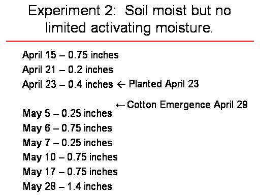 April 15 – 0.75 inches <BR>April 21 – 0.2 inches <BR>April 23 – 0.4 inches <BR> <BR>May 5 – 0.25 inches <BR>May 6 – 0.75 inches <BR>May 7 – 0.25 inches <BR>May 10 – 0.75 inches <BR>May 17 – 0.75 inches <BR>May 28 – 1.4 inches <BR> <BR> <BR>? Planted April 23<BR>? Cotton Emergence April 29<BR>Experiment 2:  Soil moist but no limited activating moisture.<BR>