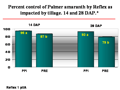 Percent control of Palmer amaranth by Reflex as impacted by tillage. 14 and 28 DAP.*<BR>95 a<BR>87 b<BR>93 a<BR>PPI<BR>Reflex 1 pt/A<BR>PRE<BR>PRE<BR>79 b<BR>PPI<BR>14 DAP<BR>28 DAP<BR>