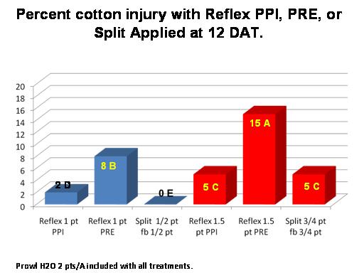 Percent cotton injury with Reflex PPI, PRE, or Split Applied at 12 DAT. <BR>2 D <BR>Prowl H2O 2 pts/A included with all treatments.<BR>5 C<BR>15 A<BR>5 C<BR>