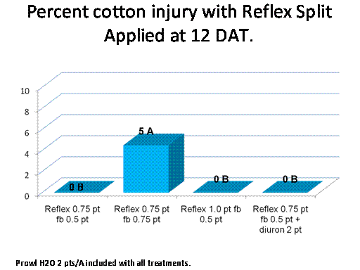 Percent cotton injury with Reflex Split Applied at 12 DAT. <BR>0 B<BR>Prowl H2O 2 pts/A included with all treatments.<BR>