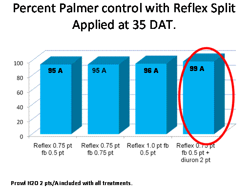 Percent Palmer control with Reflex Split Applied at 35 DAT. <BR>95 A <BR>96 A<BR>99 A<BR>Prowl H2O 2 pts/A included with all treatments.<BR>