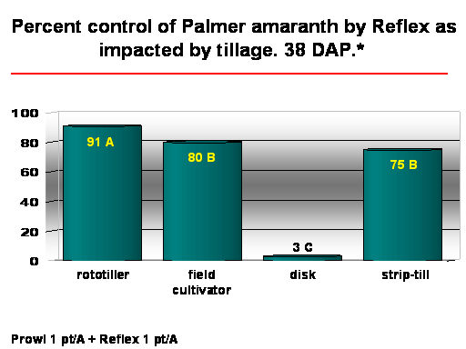 Percent control of Palmer amaranth by Reflex as impacted by tillage. 38 DAP.*<BR>80 B<BR>91 A<BR>3 C<BR>Prowl 1 pt/A + Reflex 1 pt/A<BR>strip-till<BR>field cultivator<BR>rototiller<BR>75 B<BR>disk<BR>