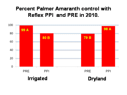 Percent Palmer Amaranth control with Reflex PPI  and PRE in 2010.<BR>99 A <BR>79 B<BR>98 A<BR>Irrigated<BR>Dryland <BR>