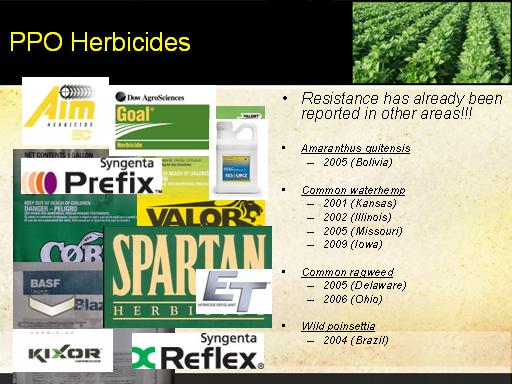 PPO Herbicides<BR>Resistance has already been reported in other areas!!! <BR> <BR>Amaranthus quitensis <BR>2005 (Bolivia) <BR> <BR>Common waterhemp <BR>2001 (Kansas) <BR>2002 (Illinois) <BR>2005 (Missouri) <BR>2009 (Iowa) <BR> <BR>Common ragweed <BR>2005 (Delaware) <BR>2006 (Ohio) <BR> <BR>Wild poinsettia <BR>2004 (Brazil) <BR> <BR> <BR> <BR>