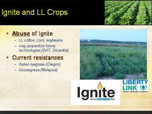 Ignite and LL Crops<BR>Abuse of Ignite <BR>LL cotton, corn, soybeans <BR>may jeopardize future technologies (DHT, Dicamba) <BR>Current resistances <BR>Italian ryegrass (Oregon) <BR>Goosegrass (Malaysia) <BR>	 <BR>