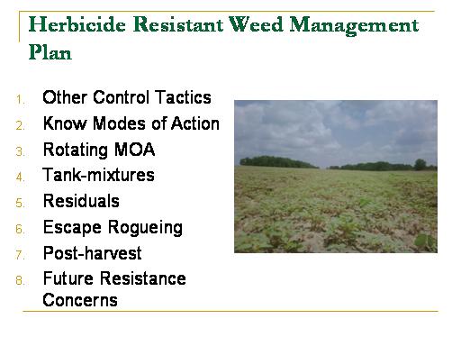 Herbicide Resistant Weed Management Plan<BR>Other Control Tactics <BR>Know Modes of Action <BR>Rotating MOA <BR>Tank-mixtures <BR>Residuals <BR>Escape Rogueing <BR>Post-harvest <BR>Future Resistance Concerns <BR> <BR>