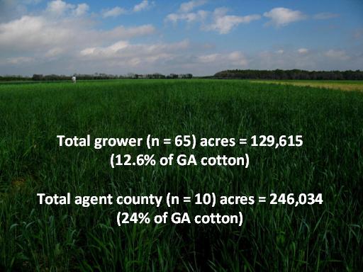 Total grower (n = 65) acres = 129,615  <BR>(12.6% of GA cotton) <BR> <BR>Total agent county (n = 10) acres = 246,034  <BR>(24% of GA cotton)<BR>