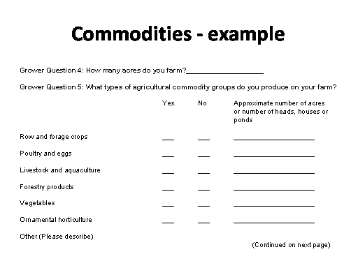 Commodities - example<BR>Grower Question 4: How many acres do you farm?____________________ <BR> <BR>Grower Question 5: What types of agricultural commodity groups do you produce on your farm? <BR>						 <BR>				Yes	No	Approximate number of acres  <BR>						or number of heads, houses or 							ponds <BR> <BR>Row and forage crops			___	___	_____________________ <BR> <BR>Poultry and eggs			___	___	_____________________ <BR> <BR>Livestock and aquaculture		___	___	_____________________ <BR> <BR>Forestry products			___	___	_____________________ <BR> <BR>Vegetables				___	___	_____________________ <BR> <BR>Ornamental horticulture		___	___	_____________________ <BR> <BR>Other (Please describe) <BR>                                                                                                                         (Continued on next page)		<BR>