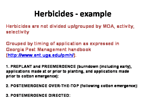 Herbicides - example<BR>Herbicides are not divided up/grouped by MOA, activity, selectivity <BR> <BR>Grouped by timing of application as expressed in Georgia Pest Management handbook (http://www.ent.uga.edu/pmh/). <BR> <BR>1. PREPLANT and PREEMERGENCE (burndown (including early), applications made at or prior to planting, and applications made prior to cotton emergence): <BR> <BR>2. POSTEMERGENCE OVER-THE-TOP (following cotton emergence): <BR> <BR>3. POSTEMERGENCE DIRECTED: <BR>			<BR>