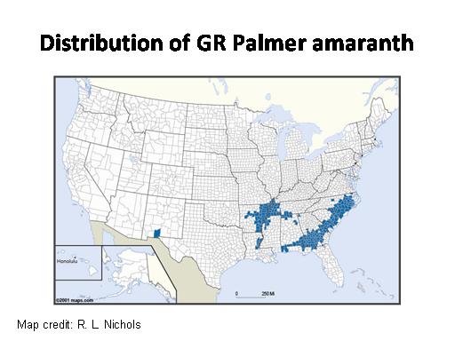 Distribution of GR Palmer amaranth<BR>Map credit: R. L. Nichols<BR>
