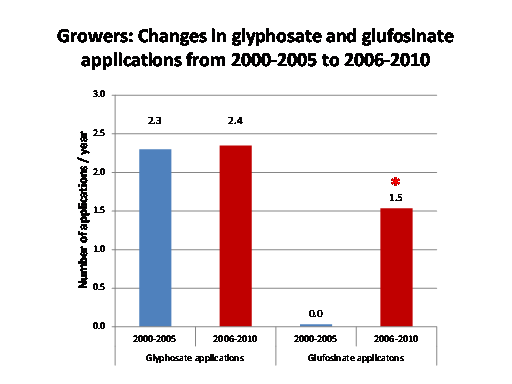 Growers: Changes in glyphosate and glufosinate applications from 2000-2005 to 2006-2010<BR>*<BR>