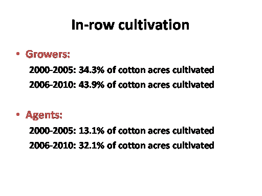 In-row cultivation<BR>Growers: <BR>2000-2005: 34.3% of cotton acres cultivated <BR>2006-2010: 43.9% of cotton acres cultivated <BR> <BR>Agents: <BR>2000-2005: 13.1% of cotton acres cultivated <BR>2006-2010: 32.1% of cotton acres cultivated <BR>