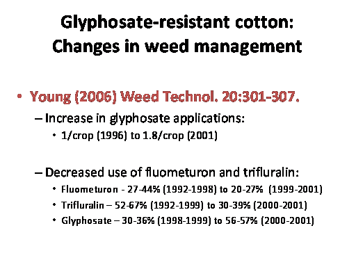 Glyphosate-resistant cotton: Changes in weed management<BR> <BR>Young (2006) Weed Technol. 20:301-307. <BR>Increase in glyphosate applications: <BR>1/crop (1996) to 1.8/crop (2001) <BR> <BR>Decreased use of fluometuron and trifluralin: <BR>Fluometuron - 27-44% (1992-1998) to 20-27%  (1999-2001) <BR>Trifluralin – 52-67% (1992-1999) to 30-39% (2000-2001) <BR>Glyphosate – 30-36% (1998-1999) to 56-57% (2000-2001)<BR>