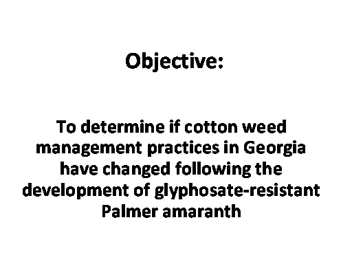 Objective:<BR>To determine if cotton weed management practices in Georgia have changed following the development of glyphosate-resistant Palmer amaranth<BR>