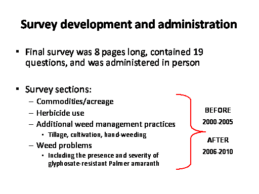 Survey development and administration<BR>Final survey was 8 pages long, contained 19 questions, and was administered in person <BR> <BR>Survey sections: <BR>Commodities/acreage <BR>Herbicide use <BR>Additional weed management practices <BR>Tillage, cultivation, hand-weeding <BR>Weed problems <BR>Including the presence and severity of                                glyphosate-resistant Palmer amaranth <BR>BEFORE <BR>2000-2005<BR>AFTER <BR>2006-2010<BR>