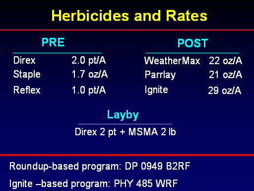 Herbicides and Rates<BR>Roundup-based program: DP 0949 B2RF <BR>Ignite –based program: PHY 485 WRF<BR>