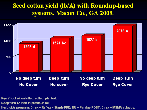 1627 b<BR>No deep turn <BR>No Cover<BR>Deep  turn <BR>No cover<BR>Rye 7 foot when killed, rolled, planted. <BR>Deep turn 12 inch in previous fall. <BR>Herbicide program: Direx + Reflex + Staple PRE; RU + Parrlay POST, Direx + MSMA at layby.<BR>1298 d<BR>1524 bc<BR>2078 a<BR>Seed cotton yield (lb/A) with Roundup-based systems. Macon Co., GA 2009.<BR>No deep turn <BR>Rye Cover<BR>Deep  turn <BR>Rye Cover<BR>